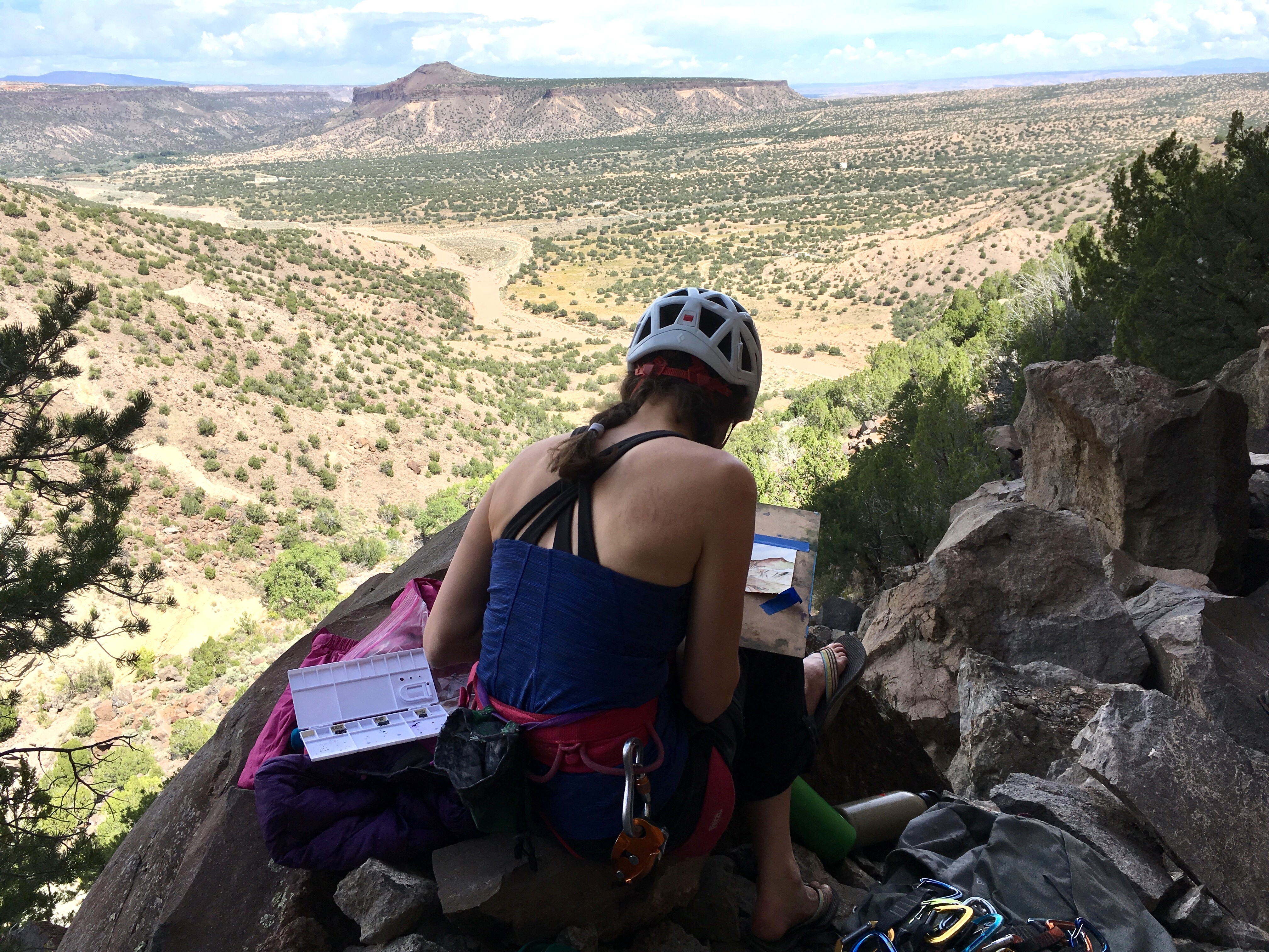My hobbies mostly involve being outside and trying to connect with the land. I can't explain why I love climbing so much, except that the feeling of my fingers on the rock on a warm day fills up my cup of joy. I took up painting en plein air (i.e., outside) in 2019 when a shoulder injury sidelined me from climbing. Although I'd loved making art as a kid, my critical inner voice (that jerk!) made me stop painting for many years until I realized it wasn't about perfection. I deeply enjoy the process of looking, seeing, and interpreting the feeling of a scene on paper, usually with watercolor and sometimes ink.